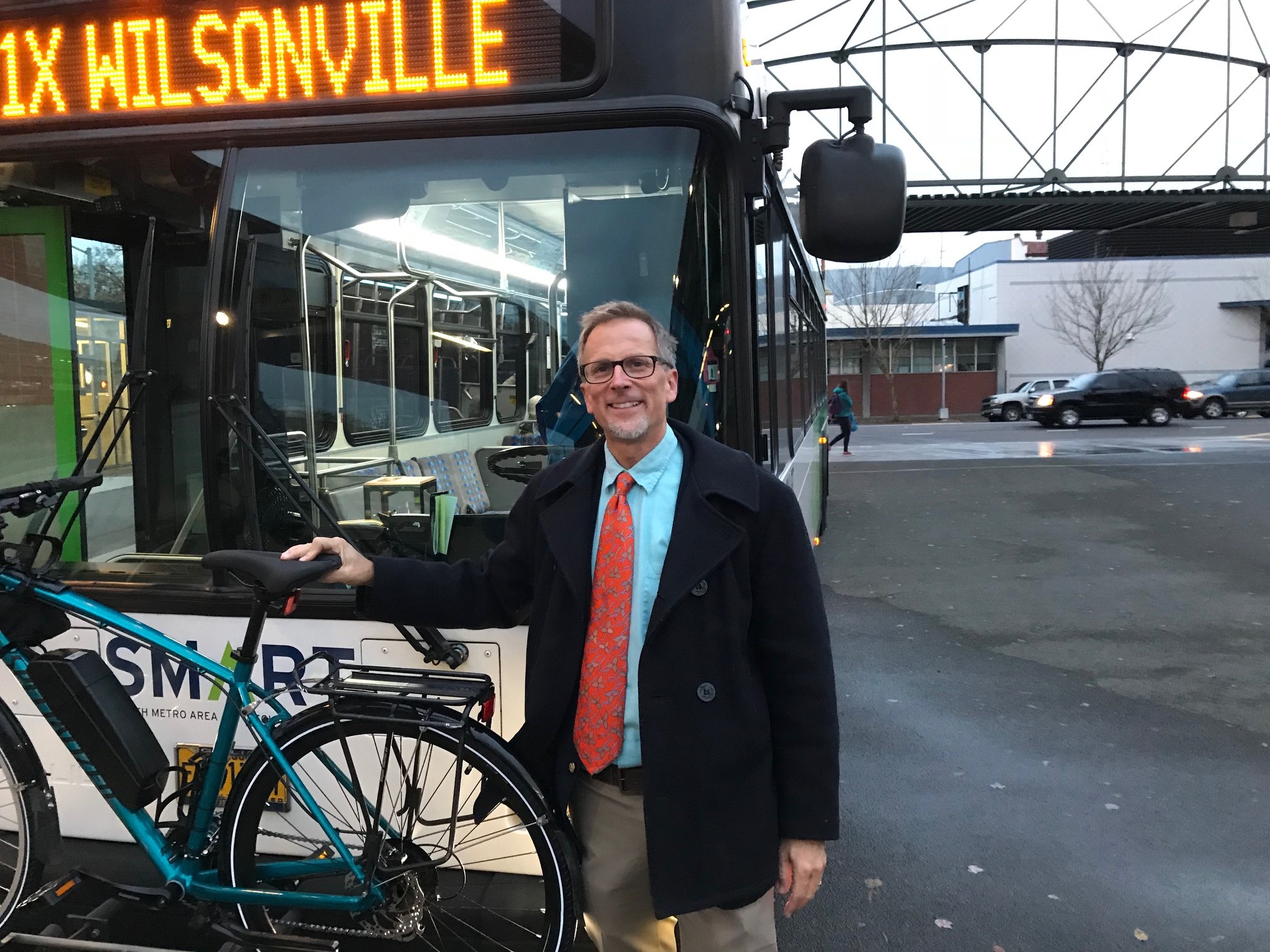 Thanks to the bike racks on the Route 1X buses, Moody starts his day with a cardio workout. He rides his bike from his Wilsonville home to reach the transit center in Wilsonville, where he boards a bus heading south.